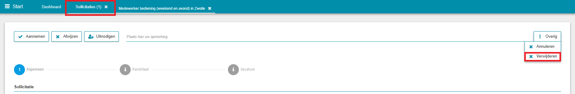 Hierna krijg je de melding dat de sollicitatie is verwijderd. De solliciatie is nu verwijderd.