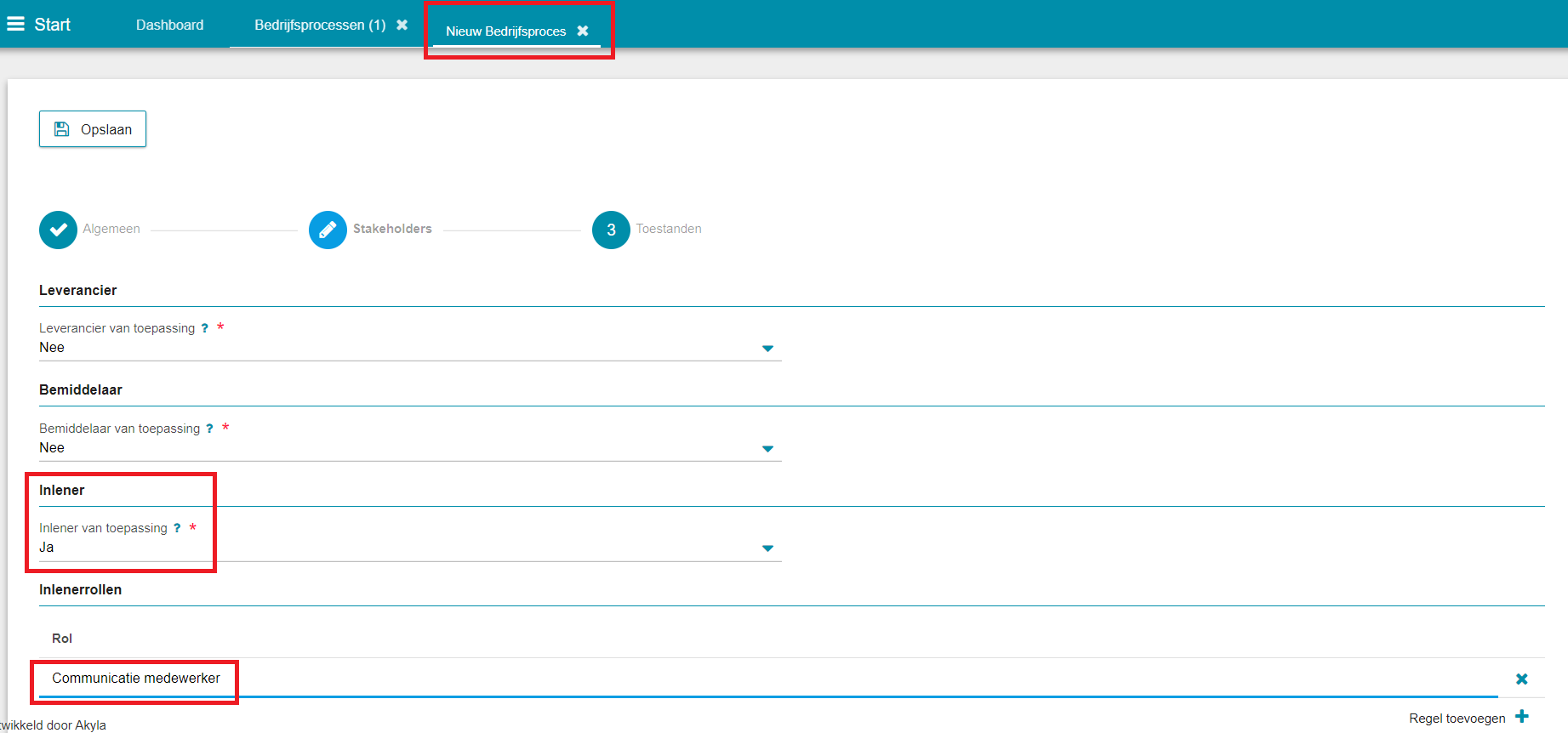 Klik op 2 Stakeholders. Hier kun je instellen welke gebruikers betrokken zijn bij het bedrijfsproces. Bij Vraag 2 is bepaald dat dit bedrijfsproces voor de inlener en flexkracht is. Voeg voor dit artikel daarom de inlener en de flexkracht toe.